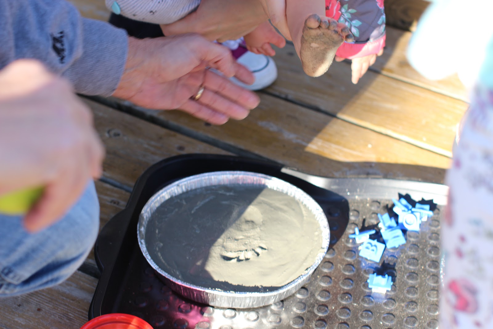 We will do this annually so our family can see how giant our kids’ feet are and remind them to buy us shoes. We think next year we might have to get a bigger pie plate for Mighty Moxie Monster Feet.