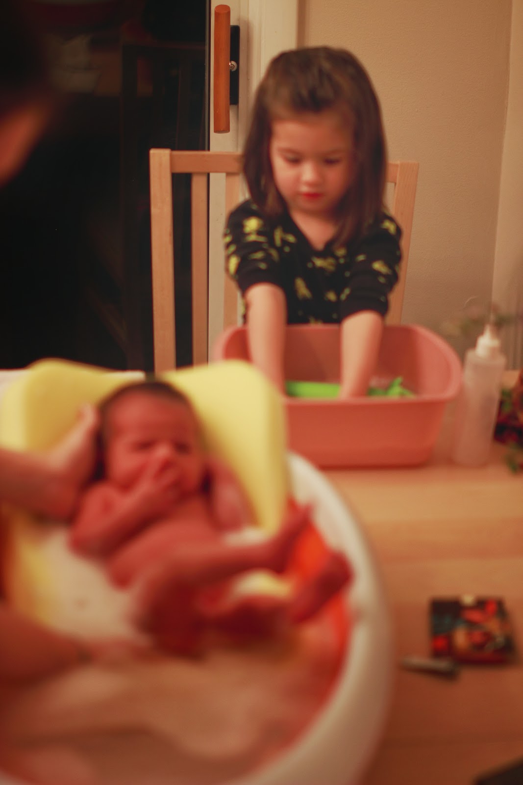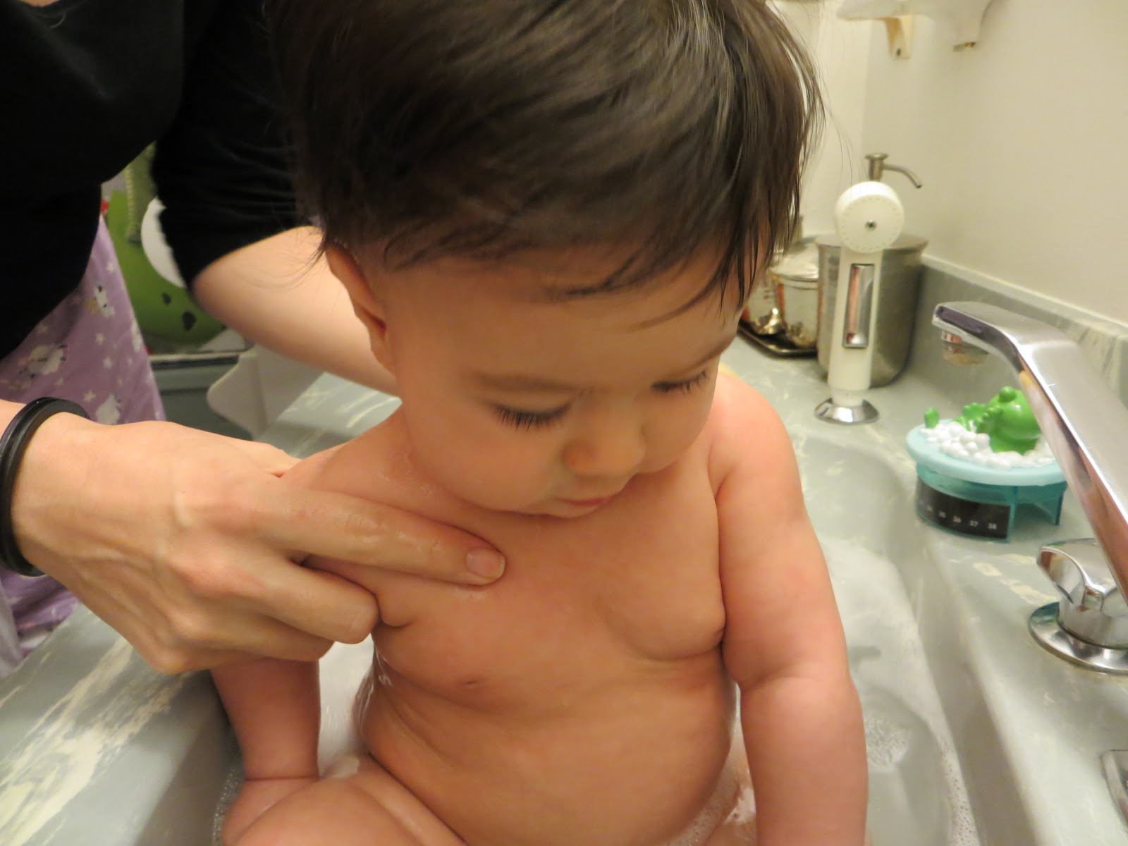 When Strider and I moved out east we were lucky enough to rent Jerry Mark’s house. It is a really cool place with bad ass features like toilet paper holders that are also radios, cool kitchen linoleum, cool modern furniture, beautiful hardwood floors, and a sink in the bathroom perfect for baby baths. Moxie usually takes her bath in the bathtub inside a baby bath. We decided to try bathing her in the ultra hip sink. She is starting to play with her toes and toys while getting a bath. She really likes to kick her feet out randomly while bathing–which really makes the whole thing much more exciting for mom.