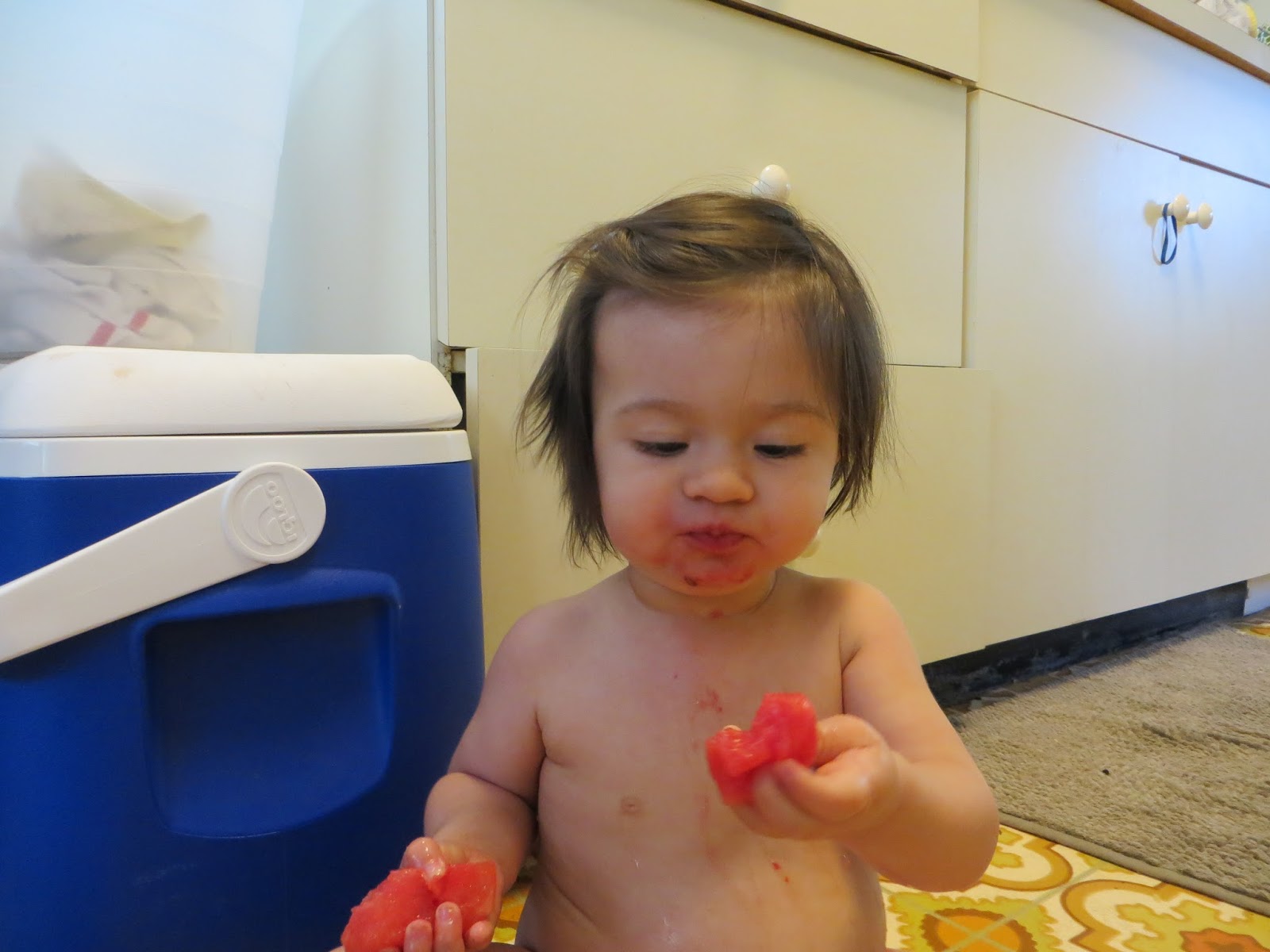 Following various recipes (super complex–blend food add breast milk) we us the blender Grandpa and Grandma got us and the baby food cube trays Bibi and Babu got us. We then freeze the food and pop out the cubes and keep frozen in ziplocks. When we feed her we just thaw a cube or two in the fridge, nuke for a 10 seconds and feed. She doesn’t like cold food. Honestly, who does?